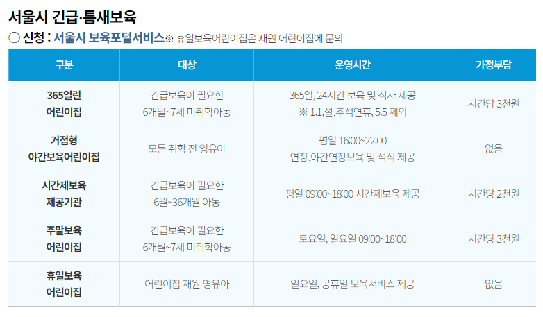 서울시 긴급 + 틈새보육 운영시간 및 비용