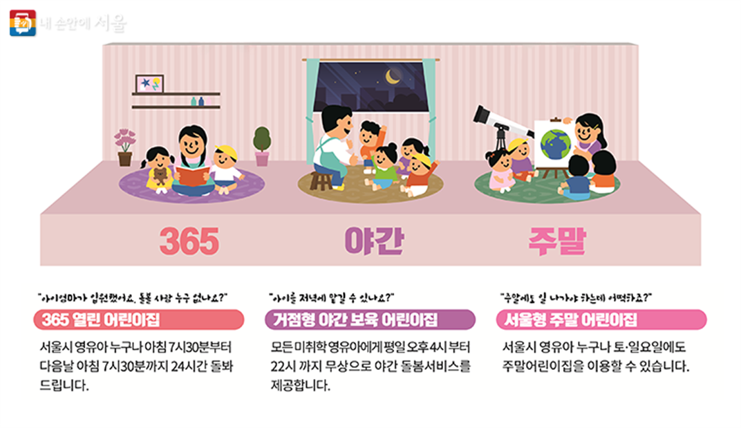 ■ 서울시가 늦은 시간까지 일하는 자영업자나 교대근무 때문에 주말 근무가 빈번한 양육자 등을 위해 주말이나 야간에도 안심하고 맡길 수 있는 서울형 긴급‧틈새보육 3종 서비스를 확대‧강화한다고 밝혔습니다.