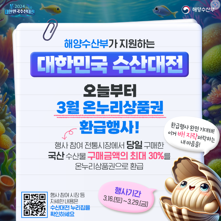고물가 시대에 거국적인 해산물 할인찬스를 소개합니다. 평소 해산물 자주 사먹기 힘드셨죠? 대한민국 수산대전에서 최대 50% 수산물 할인 행사를 진행합니다. 해양수산부와 주요 온라인, 오프라인, 전통시장이 함께하는 국내산 수산물 최대 할인 행사 대한민국 수산대전을 소개합니다. 온라인 쿠폰과 오프라인 쿠폰 그리고 제로페이 사용법까지 자세하게 정리했습니다.