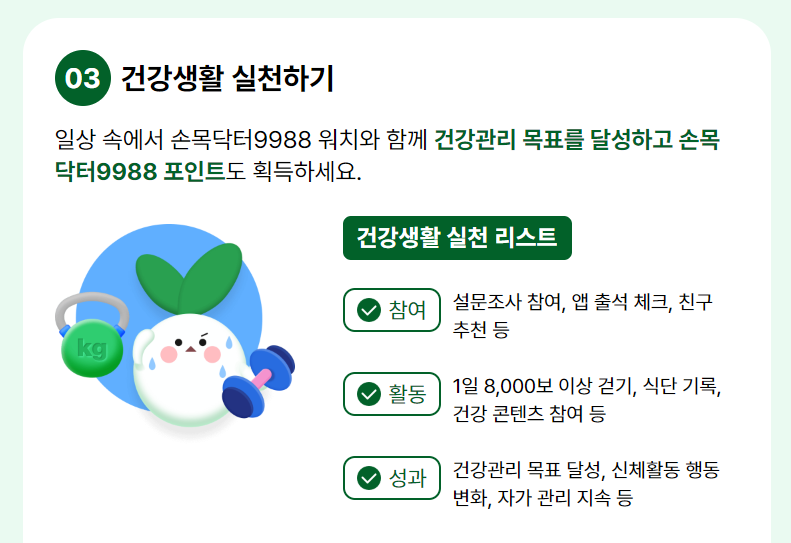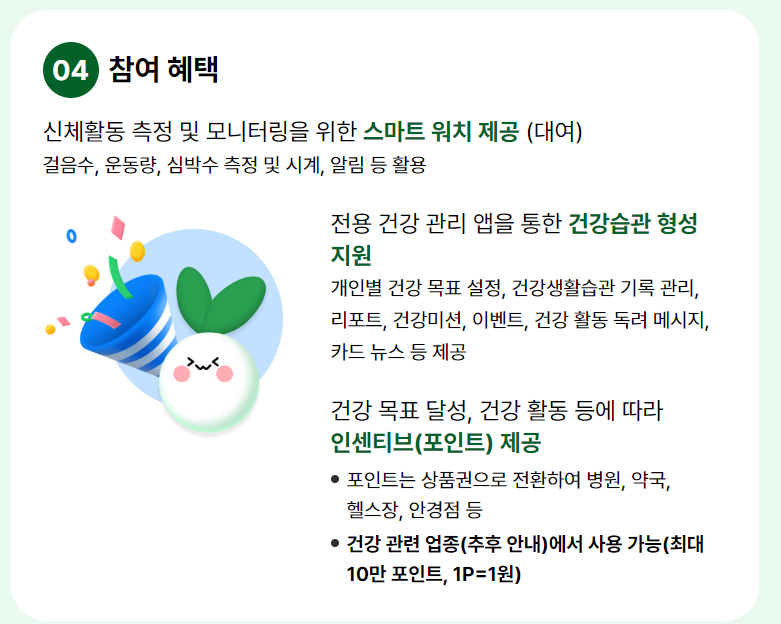 | 참여 (8,300p) | 건강목표 및 실천목표 설정, 설문조사 참여, 출석 체크 등 | 10p ~ 1,800p / 회 최대 8,300p |