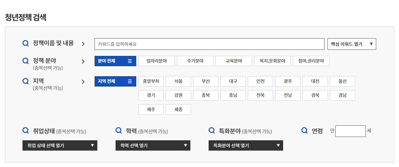 - 정책정보 : 정책 검색, 추천, 소식까지 청년 정책을 키워드, 주제, 정책명 등으로 쉽게 검색하여 비교하고, 개인의 연령, 거주지역, 관심 분야 등을 기반으로 하여 맞춤혀으로 나에게 필요한 정책을 추천하여 알맞은 정보를 제공받을 수 있습니다.