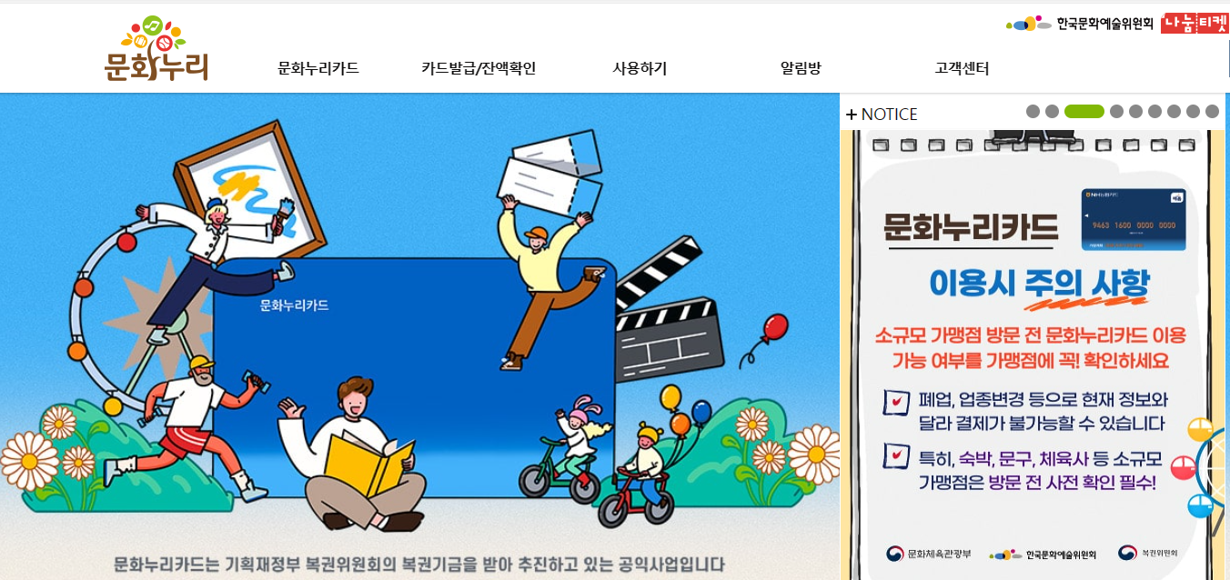 기초생활수급자와 차상위계층을 대상으로 문화예술 국내여행, 체육활동 등 최소한의 문화 생활을 영위할 수 있도록 국가에서 지원하기 위해 발급하는 카드입니다. 문화누리카드 사업 특성상 문화, 관광, 체육분야의 서비스로 사용처가 한정되어 있습니다.