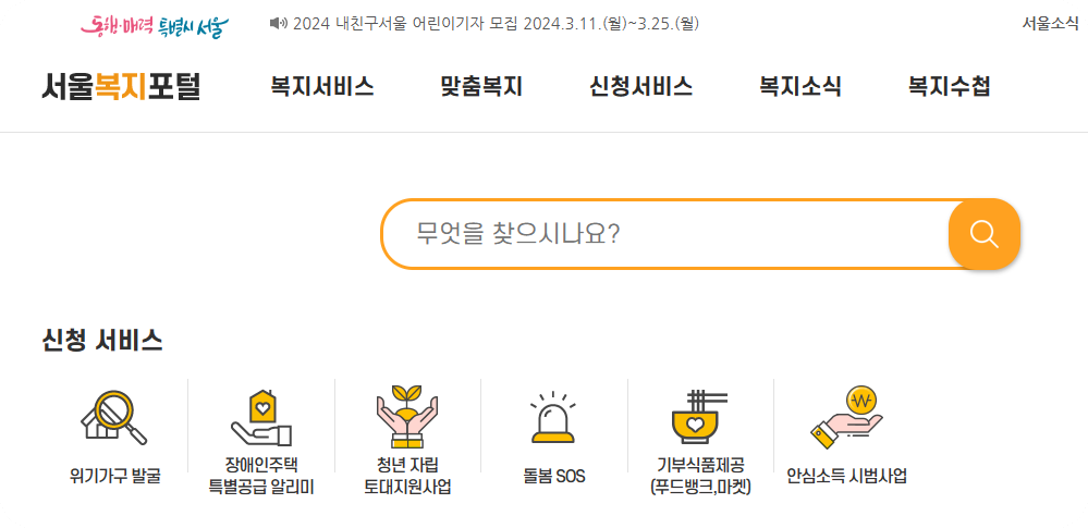 - 서울복지포털 : 복지서비스 정보통합창구로 복지 관련 서비스 신청 및 검색을 편리하게 할 수 있습니다